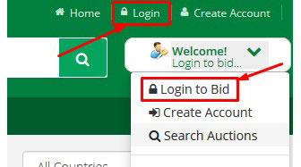Once you have an account, you will need to login and register for each auction you want to participate in. Login where ever you see the login links. Buttons are at the top right of the site, on each auction on the calendar and on every lot.