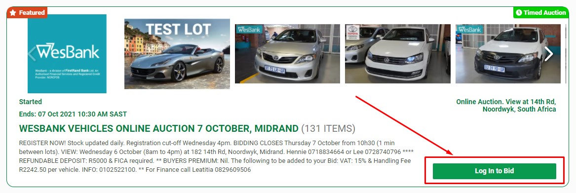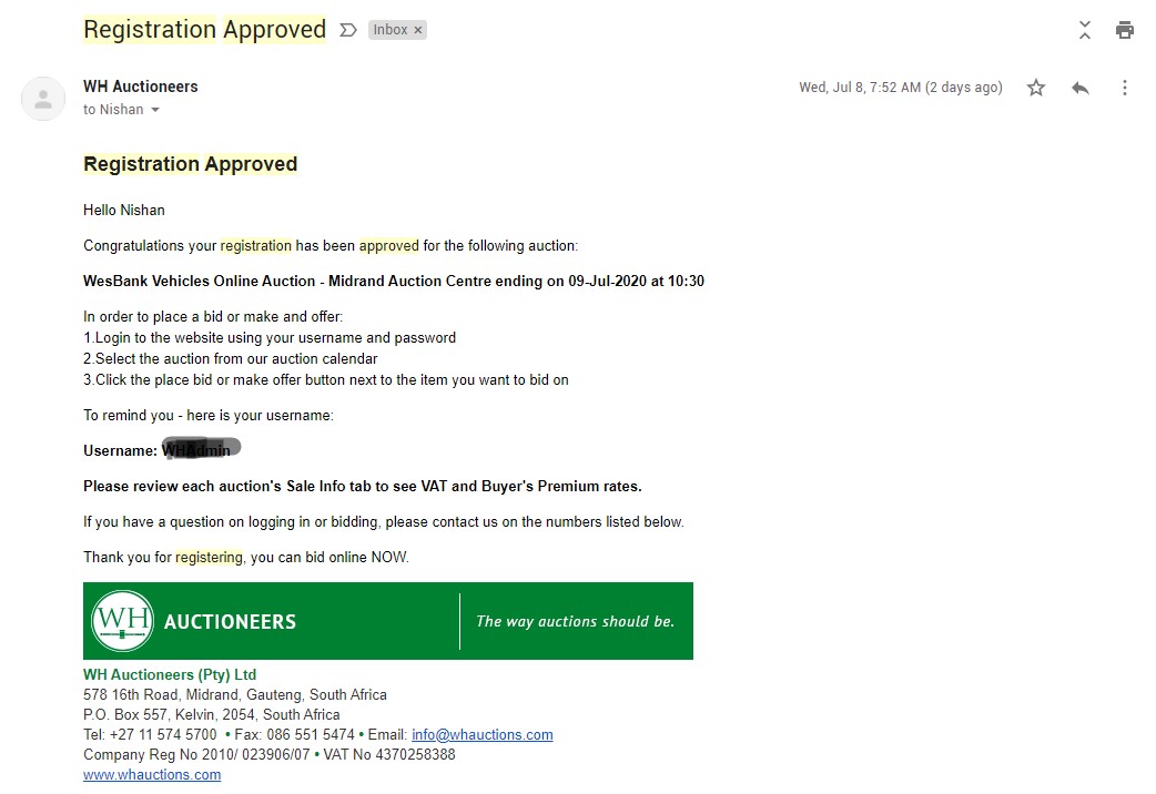 Bank details will be emailed to you but can also be seen here. WH Midrand Bank Details bank.whauctions.com Use your surname, ID or company name as reference for payments.