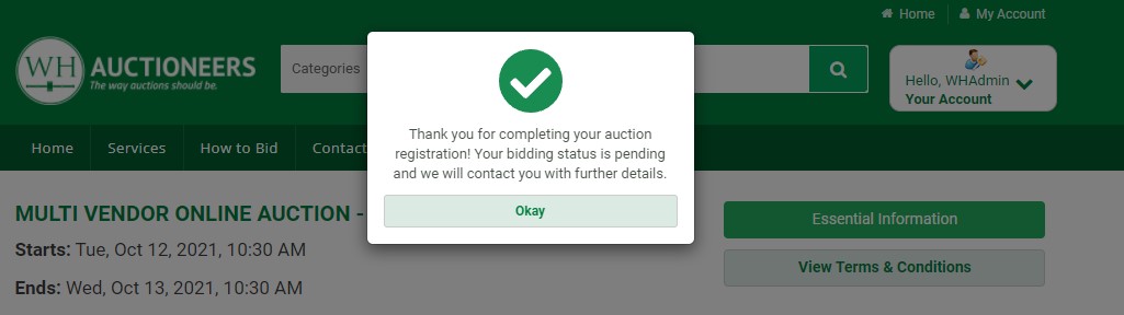 1) Once you submit you registration request, you will see the following confirmation message as well as a notification on the auction, as per below.